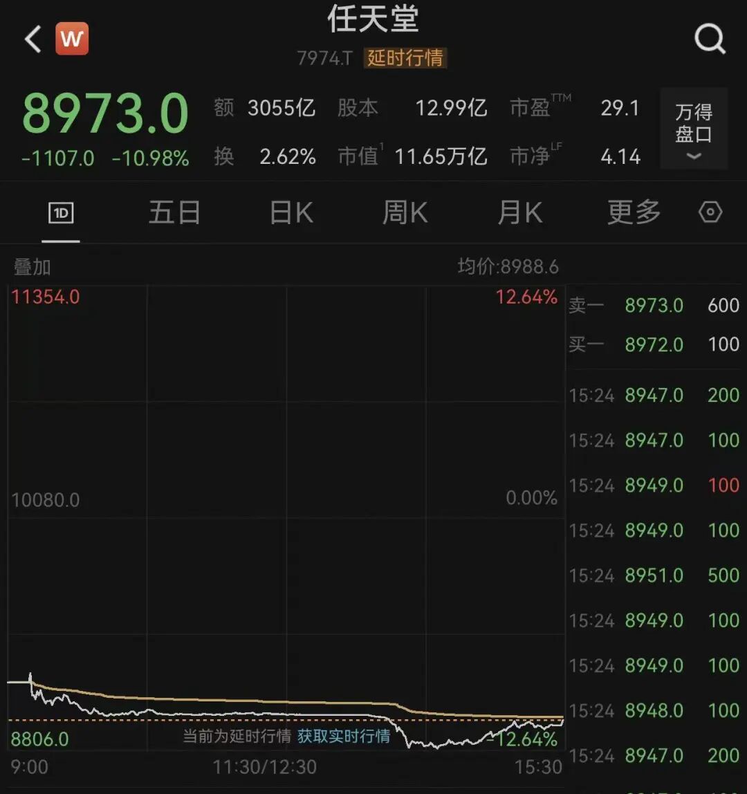 本日(2月4日),在日本股票市集上,驰名电子游戏公司任天国的股价放量暴跌,盘中跌幅一度进步12%,创18个月来最大单日跌幅,终结收盘,股价仍大跌近11%,单日市值挥发1.44万亿日元,折合东谈主民币约640亿元。