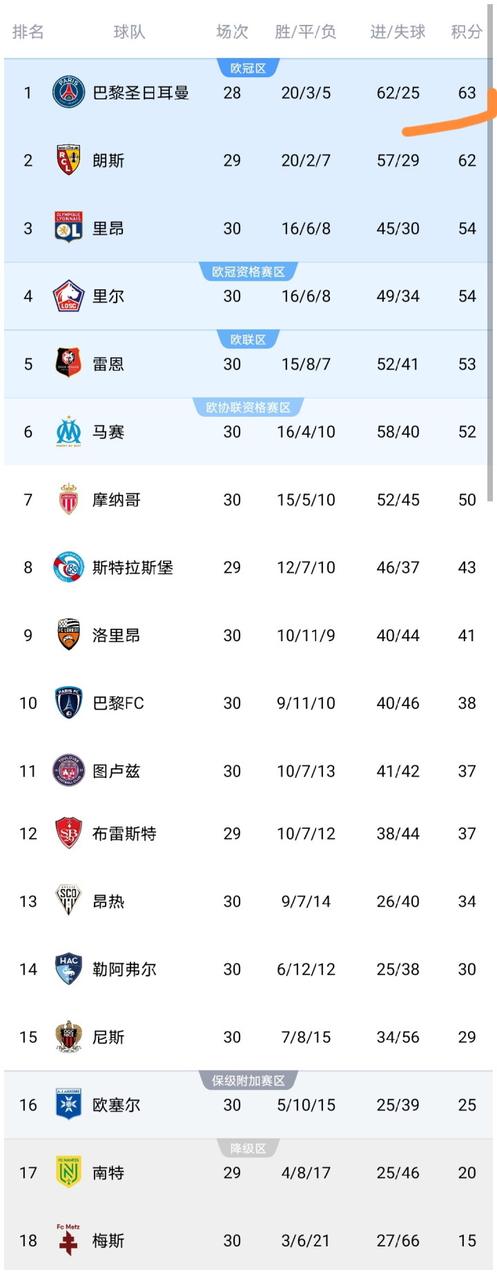这场比赛之后,法甲积分榜发生变化:不错看到巴黎圣日耳曼队积分停留在了63分,少赛一场仅超越第2的朗斯队1分,而里昂队积分飞腾到了54分,从第6升至第3。