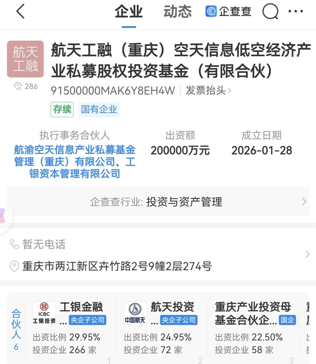 企查查深切,2026年1月28日,航天工融(重庆)空天信息低空经济产业私募股权投资基金(有限联合)在重庆两江新区设立,出资额20亿元。