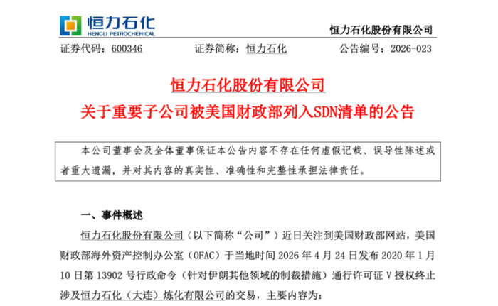 恒力石化(600346)4月26日晚间发布《对于垂危子公司被好意思国财政部列入SDN清单的公告》。