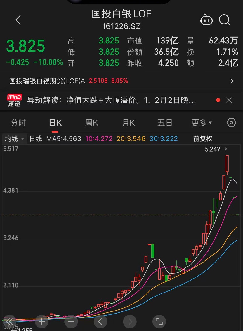 2月4日,国投白银LOF在10点30复牌后一字跌停,贯串三连跌,溢价仍高达64.6%,场内有2.4亿元成交额,意味着依然有资金顶着高溢价买入。