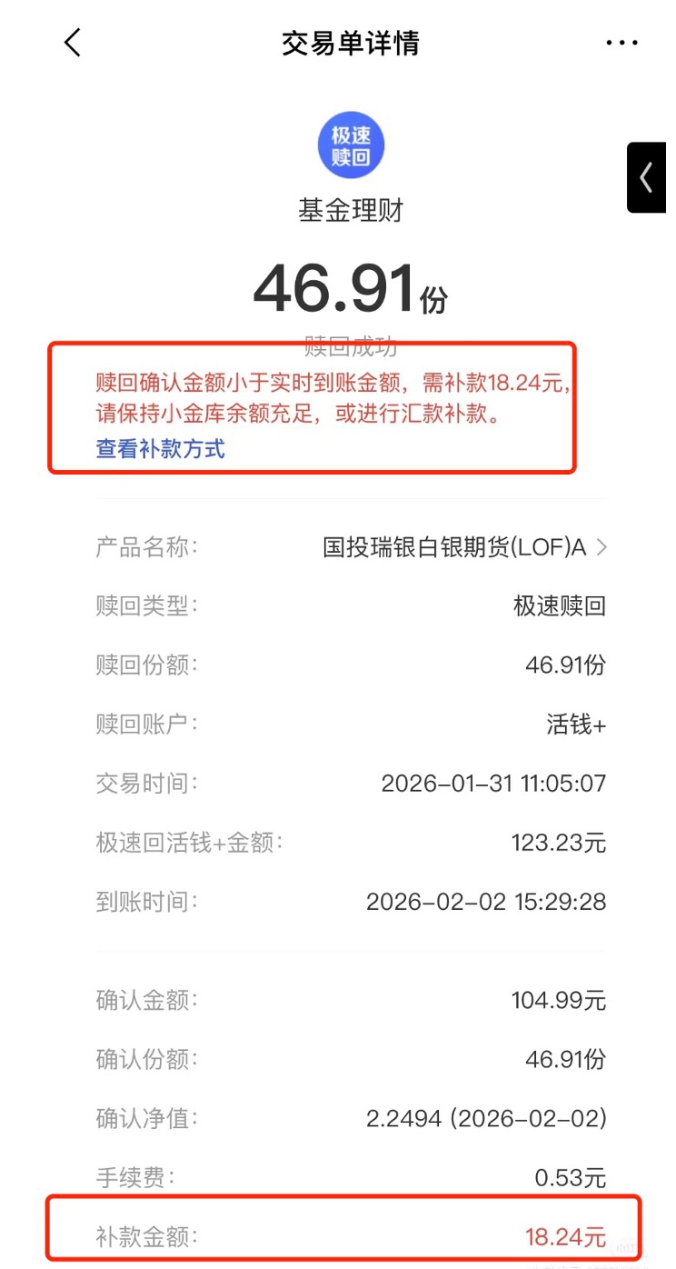 2月3日,有投资者晒图称,我方赎归国投白银期货LOFA份额46.91份基金,使用了快速赎回,赎回金额为123.23元,但最终该份额阐述净值后,金额为104.99元,该投资者赎回阐述金额小于实时到账金额,被见知要补款18.24元。从补款情势为小金库余额来看,该平台为京东金融。