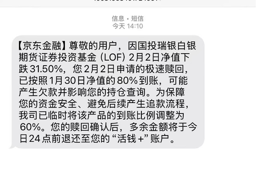 随后也有网友晒出京东金融转机国投白银LOF快赎到账比例的音问见知。该见知显露,因国投瑞银白银期货证券投资基金(LOF)2月2日净值下落 31.50%,2月2日恳求的极速赎回已按照1月30日净值的80%到账,可能产生欠款并影响持仓查询。为保险资金安全、幸免后续产生追款历程,公司已临时将该居品的到账比例转机为60%。