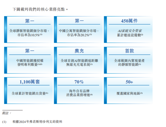 根据弗若斯特沙利文的资料,鹿客科技在多个细分市场均处于领先地位。静脉智能锁出货量位居全球第一,市场占有率为10.5%。