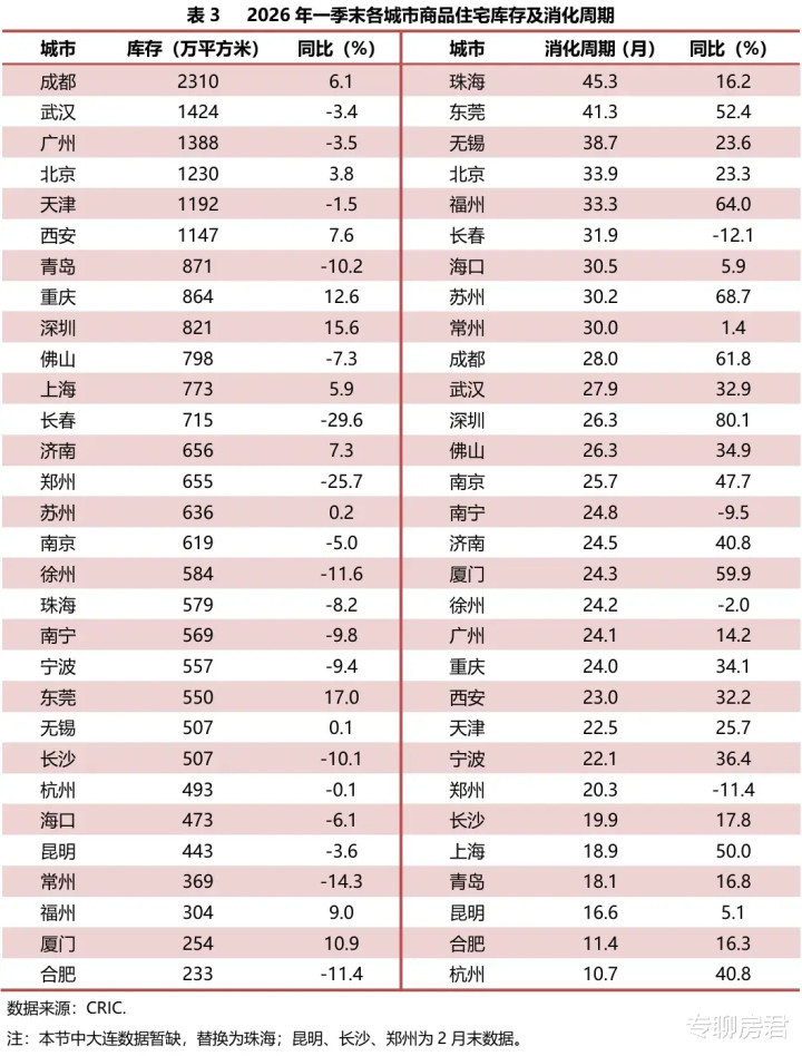 中房网发布的2026年一季度楼市阐发,圆善统计了30座重心城市库存数据:成都商品住宅库存体量最大,合肥库存边界最少;12座城市库存小幅飞腾,深圳、东莞涨幅靠前,反应出热点城市需求隆盛、房源去化快速;18座城市库存执续下降,长春、郑州去化奏效显耀,合肥、青岛等地库存稳步回落。